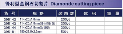 ●优质合金钢材料,使用寿命长。 ●切割一般硬度石材,瓷砖,混凝土。 ●易耗品。